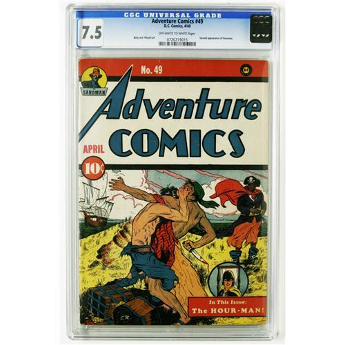 <B>Adventure Comics #49 (DC, 1940) CGC VF- 7.5 Off-white to white pages.</B></I> Sheldon Moldoff provided the last 'generic' cover for the title with this issue, which featured the second appearance of Hourman. Bernard Baily and Creig Flessel contributed interior art. CGC has certified just one nicer copy to date. Overstreet 2006 VF 8.0 value = $1,669. CGC census 03/06: 2 in 7.5, 1 higher.