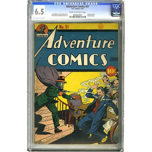 <B>Adventure Comics #51 (DC, 1940) CGC FN+ 6.5 Cream to off-white pages.</B></I> The most elegant crimefighter in comics, the Sandman, was brought to life in elegant fashion by Creig Flessel on this issue's cover. The issue also has an Hourman story. Flessel, Bernard Baily, and Joe Shuster are among the contributing interior artists. Overstreet 2006 FN 6.0 value = $1,017; VF 8.0 value = $2,204. CGC census 3/06: 3 in 6.5, 6 higher.