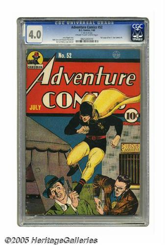<B>Adventure Comics #52 (DC, 1940) CGC VG 4.0 Cream to off-white pages.</B></I> The pill-popping (but in a good way) superhero Hourman got cover billing here, and he's drawn by Bernard Baily, who also drew the hero's adventure inside the book. The Sandman stars in one of the book's other features. Any kids who might have wondered what those two heroes do in their spare time would have been very interested to see this book's full-page ad for <B>All Star Comics</B></I> #1. CGC notes, "6-inch tear on 3rd page." Overstreet 2005 VG 4.0 value = $462. CGC census 6/05: 2 in 4.0, 7 higher.