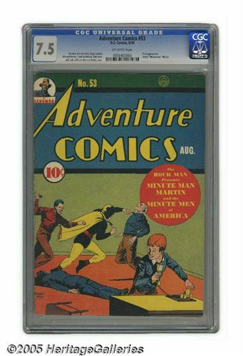 <B>Adventure Comics #53 (DC, 1940) CGC VF- 7.5 Off-white pages.</B></I> Every Golden Age hero worth his salt had a kid sidekick, and Hourman finally got one of his own with this issue in the form of Jimmy "Minute Man" Martin. The cover and Hourman story were both drawn by Bernard Baily. Also contributing were Creig Flessel (drawing the Sandman) and Bob Kane (drawing a gag feature). Overstreet 2005 VF 8.0 value = $1,444. CGC census 1/05: 1 in 7.5, 1 higher. <I>From the Northern Lights Collection.</B></I>