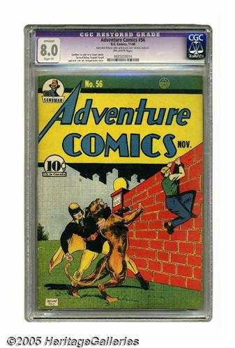 <B>Adventure Comics #56 (DC, 1940) CGC Apparent VF 8.0 Slight (P) Off-white pages.</B></I> Whether it's nabbing crooks or collaring wild animals, if it can be done in 60 minutes, Hourman is your guy. And Bernard Baily's cover is all the proof you need. The Hourman story in the book was also drawn by Baily. Backup features include the Sandman and sci-fi hero Cotton Carver. The interior artists include Baily and Howard Purcell. CGC notes, "Restoration includes: spine splits sealed, cover cleaned, reinforced." Overstreet 2005 GD 2.0 value = $231; VG 4.0 value = $462; FN 6.0 value = $693; VF 8.0 value = $1,444.