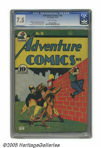 <B>Adventure Comics #56 (DC, 1940) CGC VF- 7.5 Off-white pages.</B></I> Co-stars Hourman and Sandman are the featured attractions once again in this issue. Hourman is drawn by Bernard Baily (who also drew the cover) and Sandman is rendered in the issue by Creig Flessel. Overstreet 2005 VF 8.0 value = $1,444. CGC census 1/05: 2 in 7.5, 2 higher. <I>From the Northern Lights Collection.</B></I>