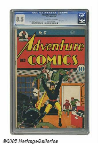 <B>Adventure Comics #57 (DC, 1940) CGC VF+ 8.5 Off-white to white pages.</B></I> "Tick Tock" Tyler, aka Hourman, is drawn by Bernard Baily, both on the cover and inside the comic. The other big star of the book, Sandman, benefited from Creig Flessel art, and there's a whole slew of other adventures to boot. This is the second highest-graded copy known to man, or at least to CGC. Overstreet 2005 VF 8.0 value = $1,444; VF/NM 9.0 value = $2,222. CGC census 1/05: 1 in 8.5, 1 higher. <I>From the Northern Lights Collection.</B></I>