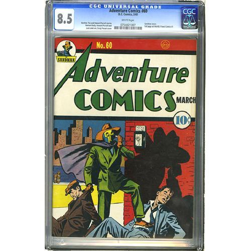 <B>Adventure Comics #60 (DC, 1941) CGC VF+ 8.5 White pages.</B></I> This absolutely superb copy is topped by only one other in CGC's current census, and we hadn't seen a copy with white pages before! Creig Flessel's run of Sandman covers are some of the best of DC's Golden Age, and we love this particular take on the best-dressed hero in comics. In addition to the Sandman adventure, this issue has an Hourman feature by Bernard Baily, as well as the usual assortment of adventure characters. Overstreet 2006 VF 8.0 value = $2,204; VF/NM 9.0 value = $3,727. CGC census 3/06: 1 in 8.5, 1 higher.