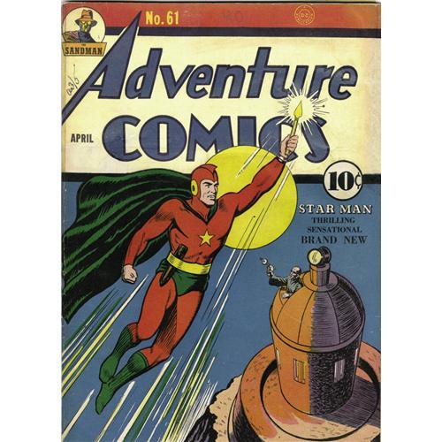 <B>Adventure Comics #61 (DC, 1941) Condition: Apparent VG/FN.</B></I> This copy's a perfect example of when professional restoration is warranted: with so few copies known to exist of this key book, a Gerber "7," preservation of existing copies is imperative! And the issue is one of the most valuable of the title's run, the first appearance of Starman with art by Jack Burnley. The extensive professional restoration to this copy includes cleaning and pressing, removal of a slight spine roll, mending of tear seals, pieces added to cover and interior, color touch, and the "marrying" of the logo of another copy onto this one. Accompanying this lot is a certificate from the restoration expert going into great detail on the measures taken. Overstreet 2006 GD 2.0 value = $1,111; VG 4.0 value = $2,222; FN 6.0 value = $3,333.