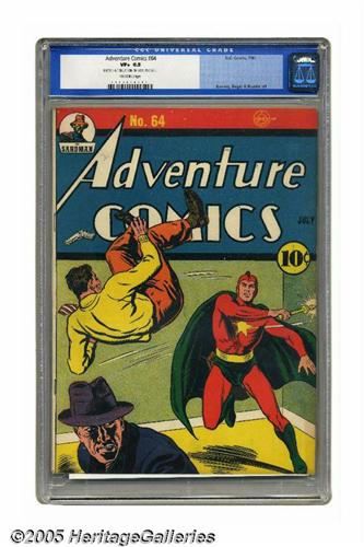 <B>Adventure Comics #64 (DC, 1941) CGC VF+ 8.5 Off-white pages.</B></I> The powers of Starman's gravity rod are on display on Jack Burnley's cover. While Starman was the headliner in this early appearance, Hourman (drawn by Bernard Baily) and Sandman (by Creig Flessel) also appear. CGC notes, "From the collection of Nicolas Cage." Overstreet 2005 VF 8.0 value = $1,200; VF/NM 9.0 value = $1,850. CGC census 6/05: 1 in 8.5, 1 higher.