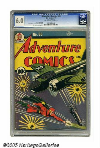 <B>Adventure Comics #65 (DC, 1941) CGC FN 6.0 Off-white to white pages.</B></I> Starman, aka Ted Knight, gets too close for comfort to a malevolent bomber on this impressive cover by Jack Burnley. DC had high hopes for Starman, granting him the lead stories in this title and soon thereafter membership in the Justice Society, replacing Hourman. The character may not have reached superstardom, but he did profit from the artwork of Burnley. Also in the issue: an Hourman story with Bernard Baily art, plus a Sandman tale. CGC notes, "1 piece of tape on cover." Only three copies of this issue have been certified with higher grades by CGC to date. Relatively modest grade still places this as the fourth highest-graded copy of #65 to be certified by CGC to date. Overstreet 2005 FN 6.0 value = $576. CGC census 6/05: 1 in 6.0, 3 higher.