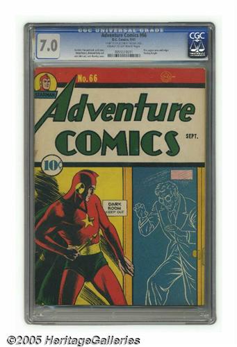 <B>Adventure Comics #66 (DC, 1941) CGC FN/VF 7.0 Cream to off-white pages.</B></I> True-blue DC fans remember the Shining Knight, a 6th-century hero who was revived from suspended animation in 1941 -- this issue to be exact. It's the origin and first appearance of the character, who would go on to be a member of the Seven Soldiers of Victory (Generation X comic fans might also remember him from the All-Star Squadron). The character profited from being rendered by top artist Creig Flessel. Other pencil-wielders in the issue are Jack Burnley (cover and Starman feature) and Bernard Baily (Hourman). There's also a Sandman story with Paul Norris art. Note that the only copy that bested this one in CGC's census is just half a grade higher at 7.5. CGC notes, "From the collection of Nicolas Cage." Overstreet 2005 FN 6.0 value = $705; VF 8.0 value = $1,470. CGC census 1/05: 1 in 7.0, 1 higher. <I>From the Northern Lights Collection.</B></I>