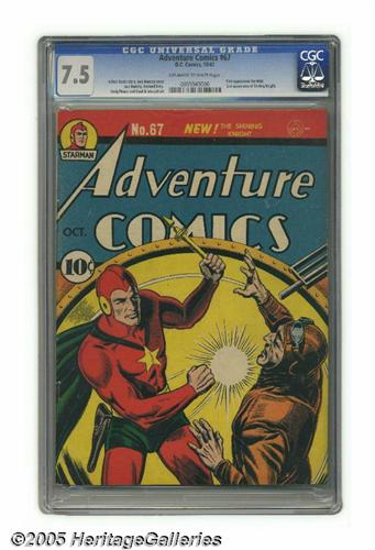 <B>Adventure Comics #67 (DC, 1941) CGC VF- 7.5 Off-white to white pages.</B></I> This issue has the origin and first appearance of the Mist, a villain who used his "inviso-solution" to evil effect. Except when Starman managed to stop him, that is. Other stories include the Shining Knight, making only his second appearance and drawn by Creig Flessel. There's also an Hourman adventure drawn by Bernard Baily. Jack Burnley drew not only the Starman story, but also the very impressive cover (called classic by Overstreet) that features that hero. Overstreet 2005 VF 8.0 value = $1,200. <I>From the Northern Lights Collection.</B></I>