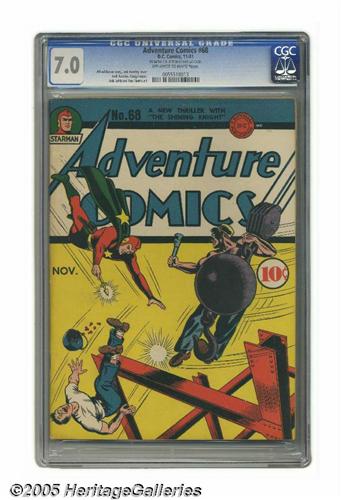 <B>Adventure Comics #68 (DC, 1941) CGC FN/VF 7.0 Off-white to white pages.</B></I> Starman soars to the rescue, thanks to his anti-gravity rod. That cover image is by Jack Burnley, as is the story featuring Starman. Other characters appearing are the Shining Knight, Hourman, and Sandman; artists include Creig Flessel and Bernard Baily. CGC notes, "From the collection of Nicolas Cage." Overstreet 2005 FN 6.0 value = $576; VF 8.0 value = $1,200. CGC census 1/05: 1 in 7.0, 3 higher. <I>From the Northern Lights Collection.</B></I>