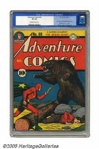 <B>Adventure Comics #69 (DC, 1941) CGC VF 8.0 Off-white to white pages.</B></I> This key issue has the first appearance of Sandy the Golden Boy as well as the debut of the "new look" Sandman, who abandoned his tailored suit and gas mask for a more standard superhero outfit. The story was drawn by Paul Norris, and if you want to read it, you have to buy the original issue, as this important story has never been reprinted! And while that's the biggest news about this book, the rest of the issue is impressive as well, with a Starman cover and story (both drawn by Jack Burnley), the Shining Knight (drawn by Creig Flessel), Hourman (drawn by Bernard Baily), and more. Overstreet 2005 VF 8.0 value = $1,250. CGC census 6/05: 1 in 8.0, 2 higher.
