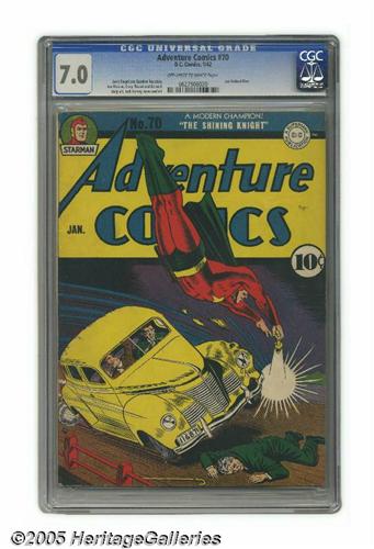 <B>Adventure Comics #70 (DC, 1942) CGC FN/VF 7.0 Off-white to white pages.</B></I> The Federal Men were an <B>Adventure Comics</B></I> standby, in fact, they first appeared in #2, when the title was still called <B>New Comics</B></I> and Jerry Siegel and Joe Shuster (who created the group) were doing story and art. But the group of FBI agents made their final appearance in this issue. Still going strong were Starman, the Shining Knight, Hourman, and Sandman, drawn by Jack Burnley, Creig Flessel, Bernard Baily, and Paul Norris, respectively. The cover is by Burnley. Overstreet 2005 FN 6.0 value = $576; VF 8.0 value = $1,200. CGC census 1/05: 1 in 7.0, 4 higher. <I>From the Northern Lights Collection.</B></I>