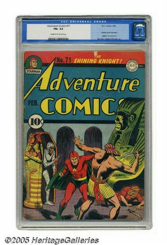 <B>Adventure Comics #71 (DC, 1942) CGC FN+ 6.5 Cream to off-white pages.</B></I> A couple of key firsts for Hourman are found in this issue -- for one, it's the first appearance of his Miraclo Machine, which would let him power up without taking pills. For another, Jimmy "Minute Man" Martin, while already a sidekick of sorts to Hourman, actually donned a costume starting in this issue. The other top characters and artists in the issue are Starman by Jack Burnley (seen on the cover as well), the Shining Knight by Creig Flessel, and the Sandman drawn by Paul Norris. Overstreet 2005 FN 6.0 value = $555; VF 8.0 value = $1,156. CGC census 3/05: 1 in 6.5, 2 higher. <I>From the Northern Lights Collection.</B></I>