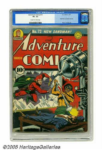 <B>Adventure Comics #72 (DC, 1942) CGC VG- 3.5 Cream to off-white pages.</B></I> When Simon and Kirby joined DC, it was quite a landmark event. This issue's Sandman story has S&K's very first work for the company, coming just a couple of issues after the character had been revamped (getting a more superhero-like costume and the addition of sidekick Sandy). The other artists (and characters in the issue) are certainly no slouches -- among them are Jack Burnley (Starman), Creig Flessel (the Shining Knight) and Bernard Baily (Hourman). Overstreet 2005 VG 4.0 value = $2,058. CGC census 1/05: 1 in 3.5, 6 higher. <I>From the Northern Lights Collection.</B></I>