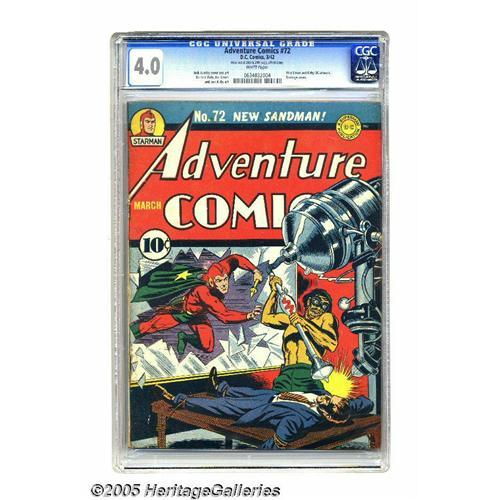 <B>Adventure Comics #72 (DC, 1942) CGC VG 4.0 White pages.</B></I> When Simon and Kirby joined DC, it was quite a landmark event. This issue's Sandman story has S&K's very first work for the company, coming just a couple of issues after the character had been revamped (getting a more superhero-like costume and the addition of sidekick Sandy). The other artists (and characters in the issue) are certainly no slouches -- among them are Jack Burnley (Starman), Creig Flessel (the Shining Knight) and Bernard Baily (Hourman). CGC notes, ""Piece out of 28th and 29th page, affects story."" Overstreet 2005 VG 4.0 value = $2,058. CGC census 8/05: 1 in 4.0, 5 higher. <BR><BR><B>Important notice:</B> Heritage usually auctions material at the rate of 200-250 lots per hour. On some occasions eBay Live bid software or the Internet may not be able to keep up with the pace of the auction. We recommend placing a realistic absentee bid now as insurance to avoid disappointment. Occasionally the auctioneer may eliminate or reject an eBay Live bid, and the auctioneer may also reopen a lot after the close of the eBay live bidding (usually because we missed an audience bid), and may reject your bid even if it shows you as the winning bidder. By bidding via eBay Live, you agree that Heritage may award the lot to another bidder at its sole discretion under the circumstances described above or any other reasonable circumstances. Since eBay bids are not shown to us until we open the lot on the floor, we treat those bids just like floor bids. In most cases the floor responds before the eBay bid is presented to us, due to Internet lag time, so for consistency we have made it a policy that floor bids are always considered first over tie eBay live bids. Also please note that all Heritage lots purchased through eBay Live carry a 20% Buyer's Premium. Please make sure you read the Terms and Conditions before you bid. This lot is being auctioned in conjunction with a live floor auction by Heritage Gall