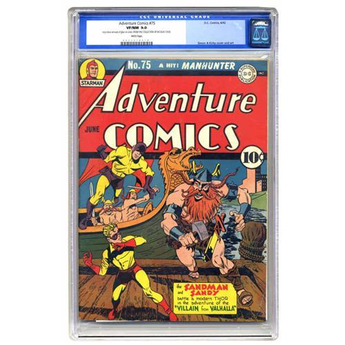 <B>Adventure Comics #75 (DC, 1942) CGC VF/NM 9.0 White pages.</B></I> On this issue's Simon and Kirby cover, the Sandman and Sandy battle... <I>Thor</B></I>? Call it a prototype if you so desire! S&K handled interior art chores on both the Sandman tale and the Manhunter story. Also appearing in this issue are Hourman, Starman, and the Shining Knight. CGC notes, "Very minor amount of glue on cover" and also, "From the collection of Nicolas Cage." Overstreet 2005 VF/NM 9.0 value = $1,778; NM- 9.2 value = $2,400. CGC census 11/05: 2 in 9.0, 1 higher.