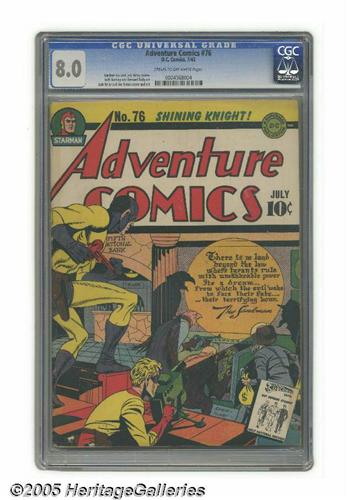 <B>Adventure Comics #76 (DC, 1942) CGC VF 8.0 Cream to off-white pages.</B></I> The fertile imaginations of Simon and Kirby never cease to astound -- the use of a projector on this issue's cover is unlike anything we've seen on a comic book. The artistic duo also drew the interior feature starring the Sandman and Sandy, and a Manhunter story as well. Other heroes in the issue include Starman (Jack Burnley art), Hourman (Bernard Baily art), and the Shining Knight. Overstreet 2005 VF 8.0 value = $1,156. CGC census 1/05: 1 in 8.0, 1 higher. <I>From the Northern Lights Collection.</B></I>
