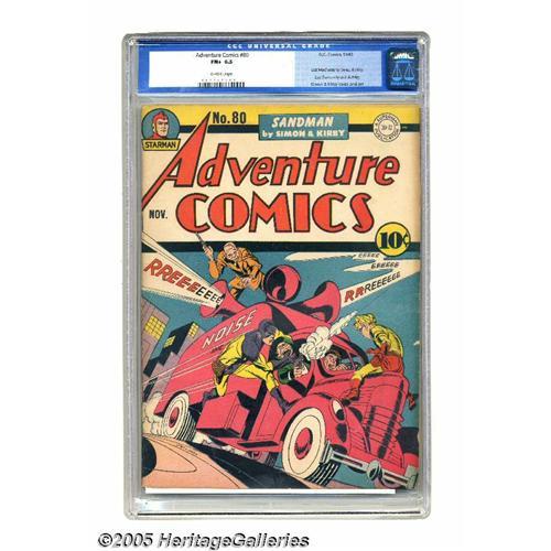 <B>Adventure Comics #80 (DC, 1942) CGC FN+ 6.5 Off-white pages.</B></I> Two great runs of an artist and a character came to an end with this issue -- it was Joe Simon and Jack Kirby's last Manhunter story and Jack Burnley's last Starman story. The issue also features an action-packed Sandman cover (and story) by S&K, an Hourman story by Bernard Baily, and a Shining Knight tale drawn by Louis Cazeneuve. Overstreet 2005 FN 6.0 value = $555; VF 8.0 value = $1,156. CGC census 7/05: 2 in 6.5, 6 higher. <I>From the Northern Lights Collection.</B></I> <BR><BR><B>Important notice:</B> Heritage usually auctions material at the rate of 200-250 lots per hour. On some occasions eBay Live bid software or the Internet may not be able to keep up with the pace of the auction. We recommend placing a realistic absentee bid now as insurance to avoid disappointment. Occasionally the auctioneer may eliminate or reject an eBay Live bid, and the auctioneer may also reopen a lot after the close of the eBay live bidding (usually because we missed an audience bid), and may reject your bid even if it shows you as the winning bidder. By bidding via eBay Live, you agree that Heritage may award the lot to another bidder at its sole discretion under the circumstances described above or any other reasonable circumstances. Since eBay bids are not shown to us until we open the lot on the floor, we treat those bids just like floor bids. In most cases the floor responds before the eBay bid is presented to us, due to Internet lag time, so for consistency we have made it a policy that floor bids are always considered first over tie eBay live bids. Also please note that all Heritage lots purchased through eBay Live carry a 20% Buyer's Premium. Please make sure you read the Terms and Conditions before you bid. This lot is being auctioned in conjunction with a live floor auction by Heritage Galleries & Auctioneers. All final auction and invoice information will be supplied by Heritage Galleries & Auctionee