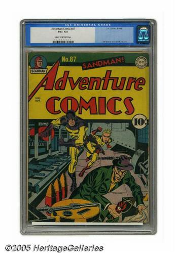 <B>Adventure Comics #87 (DC, 1943) CGC FN+ 6.5 Cream to off-white page.</B></I> For some reason this issue is about as hard to find, especially in nice grade, as any 1940s issue of the title. Gerber rates it "scarce", and CGC hasn't certified a higher grade than this 6.5. Simon and Kirby provide cover and interior art on the Sandman series. Overstreet 2005 FN 6.0 value = $357; VF 8.0 value = $744. CGC census 1/05: 1 in 6.5, none higher. <I>From the Northern Lights Collection</B></I>.