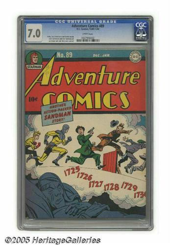 <B>Adventure Comics #89 (DC, 1944) CGC FN/VF 7.0 White pages.</B></I> Why count sheep when you can count crooks? And count on the Sandman and Sandy to round 'em up. The distinctive style of Simon and Kirby graces both this issue's cover and the accompanying story. The book also has adventures of the Shining Knight, Starman, Manhunter, and more. Overstreet 2005 FN 6.0 value = $357; VF 8.0 value = $744. CGC census 1/05: 1 in 7.0, 2 higher. <I>From the Northern Lights Collection.</B></I>