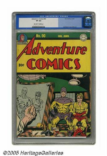 <B>Adventure Comics #90 (DC, 1944) CGC VF 8.0 Off-white to white pages.</B></I> Like many issues of DC's second-oldest comic series (originally <B>New Comics</B></I>, then <B>New Adventure Comics</B></I>), #90 has few representatives in CGC's census - just five unrestored copies to date. Simon and Kirby cover and story art is featured. Overstreet 2005 VF 8.0 value = $744. CGC census 1/05: 2 in 8.0, 2 higher. <I>From the Northern Lights Collection</B></I>.