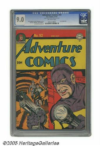 <B>Adventure Comics #92 (DC, 1944) CGC VF/NM 9.0 Off-white pages.</B></I> DC's second incarnation of Manhunter had enjoyed a nice run in this title, but this issue was his last appearance of the Golden Age; he wouldn't be seen again until the 1970s. However, the book's star, the Sandman, continued to fight crime, drawn on the cover by Simon and Kirby and inside the book by Gil Kane. Other features include Starman and the Shining Knight. CGC notes, "From the collection of Nicolas Cage." Overstreet 2005 VF/NM 9.0 value = $925; NM- 9.2 value = $1,250. CGC census 1/05: 1 in 9.0, 3 higher. <I>From the Northern Lights Collection.</B></I>