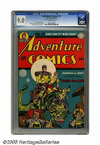 <B>Adventure Comics #93 (DC, 1944) CGC VF/NM 9.0 Off-white pages.</B></I> The distinctive style of Simon and Kirby graces this issue's Sandman cover, and while S + K didn't draw the character's story, it was in excellent hands, with Gil Kane doing the honors. Also appearing are the Shining Knight and Starman, plus the humorous adventures of brainy superhero Genius Jones. CGC notes, "From the collection of Nicolas Cage." Overstreet 2005 VF/NM 9.0 value = $925; NM- 9.2 value = $1,250. CGC census 1/05: 1 in 9.0, 1 higher. <I>From the Northern Lights Collection.</B></I>
