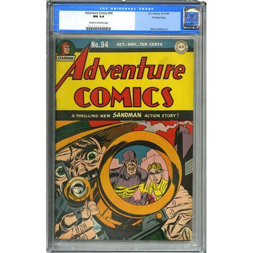 <B>Adventure Comics #94 Crowley Copy pedigree (DC, 1944) CGC NM 9.4 Cream to off-white pages.</B></I> This issue's Simon and Kirby cover can't help but grab your attention (the design is so striking that Jack Kirby revisited it decades later on the cover of <B>Captain America</B></I> #198)! The tale of the Sandman and Sandy inside the book was drawn by Gil Kane. There's more superhero action courtesy of the Shining Knight and Starman. Overstreet 2006 NM- 9.2 value = $1,300. CGC census 4/06: 1 in 9.4, 1 higher.
