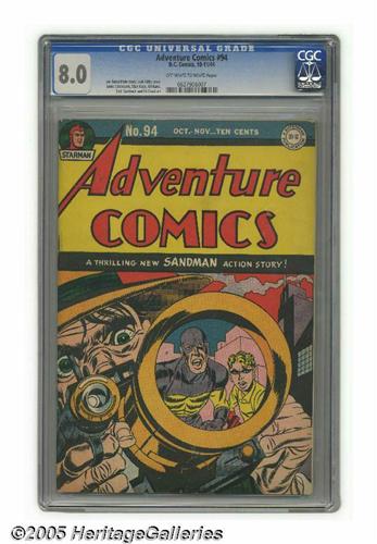 <B>Adventure Comics #94 (DC, 1944) CGC VF 8.0 Off-white to white pages.</B></I> This issue's Simon and Kirby cover can't help but grab your attention (the design is so striking that Jack Kirby revisited it decades later on the cover of <B>Captain America</B></I> #198)! The tale of the Sandman and Sandy inside the book was drawn by Gil Kane. There's more superhero action courtesy of the Shining Knight and Starman. Overstreet 2005 VF 8.0 value = $600. CGC census 1/05: 1 in 8.0, 6 higher. <I>From the Northern Lights Collection.</B></I>