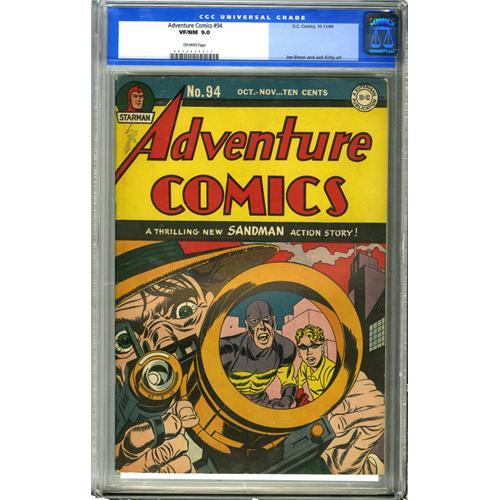 <B>Adventure Comics #94 (DC, 1944) CGC VF/NM 9.0 Off-white pages.</B></I> Cover artists Simon and Kirby knew how to grab your attention -- have a look at this one (the design is so striking that Jack Kirby revisited it decades later on the cover of <B>Captain America</B></I> #198)! The tale of the Sandman and Sandy inside the book was drawn by Gil Kane. There's more superhero action courtesy of the Shining Knight and Starman. Overstreet 2006 VF/NM 9.0 value = $950; NM- 9.2 value = $1,300. CGC census 03/06: 1 in 9.0, 2 higher.