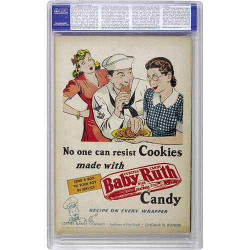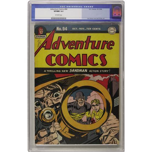 <B>Adventure Comics #94 (DC, 1944) CGC VF/NM 9.0 Off-white pages.</B></I> Cover artists Simon and Kirby knew how to grab your attention -- have a look at this one (the design is so striking that Jack Kirby revisited it decades later on the cover of <B>Captain America</B></I> #198)! The tale of the Sandman and Sandy inside the book was drawn by Gil Kane. There's more superhero action courtesy of the Shining Knight and Starman. Note that a small plastic stabilizing peg is loose inside the CGC holder, not affecting the comic itself or the integrity of the holder. Overstreet 2006 VF/NM 9.0 value = $950; NM- 9.2 value = $1,300. CGC census 9/06: 1 in 9.0, 2 higher.<BR><BR><b>Shipping:</b> Slabbed Comic (<a target="_blank" href="http://www.heritageauctions.com/common/shipping.php">view shipping information</a>)