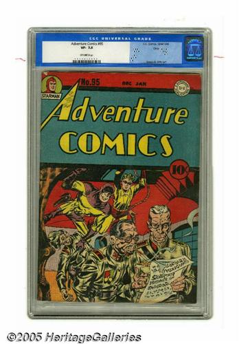 <B>Adventure Comics #95 (DC, 1944) CGC VF- 7.5 Off-white pages.</B></I> The Sandman, a powerless captive? Not so fast, Emperor-san! No doubt you recognize the distinctive style of Simon and Kirby on this issue's cover. Inside the comic, the Sandman and Sandy are joined by Starman, Genius Jones, and the Shining Knight. Overstreet 2005 VF 8.0 value = $600. CGC census 2/05: 2 in 7.5, 6 higher. <I>From the Northern Lights Collection.</B></I>