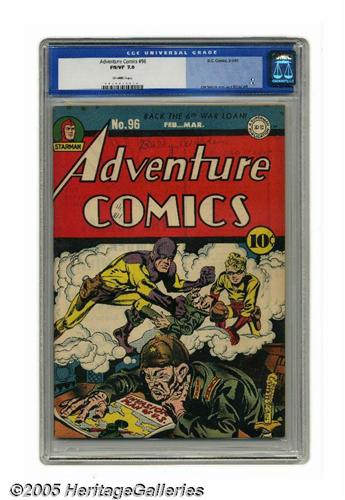 <B>Adventure Comics #96 (DC, 1945) CGC FN/VF 7.0 Off-white pages.</B></I> Simon & Kirby cover art, and interior art by a young Gil Kane mark this issue from 1945. Overstreet 2005 FN 6.0 value = $288; VF 8.0 value = $600. CGC census 1/05: 1 in 7.0, 5 higher. <I>From the Northern Lights Collection</B></I>.