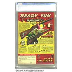 <B>Adventure Comics #96 (DC, 1945) CGC NM 9.4 Off-white to white pages.</B></I> Simon and Kirby delivered another great wish-fulfillment cover here, starring the Sandman and Sandy. Genius Jones, Starman, and the Shining Knight got their chances to shine in backup features. This is the highest grade that CGC has assigned for this issue to date. Overstreet 2004 NM- 9.2 value = $1,200. <BR><BR><B>Important notice:</B> Heritage usually auctions material at the rate of 200-250 lots per hour. On some occasions eBay Live bid software or the Internet may not be able to keep up with the pace of the auction. We recommend placing a realistic absentee bid now as insurance to avoid disappointment. Occasionally the auctioneer may eliminate or reject an eBay Live bid, and the auctioneer may also reopen a lot after the close of the eBay live bidding (usually because we missed an audience bid), and may reject your bid even if it shows you as the winning bidder. By bidding via eBay Live, you agree that Heritage may award the lot to another bidder at its sole discretion under the circumstances described above or any other reasonable circumstances. Since eBay bids are not shown to us until we open the lot on the floor, we treat those bids just like floor bids. In most cases the floor responds before the eBay bid is presented to us, due to Internet lag time, so for consistency we have made it a policy that floor bids are always considered first over tie eBay live bids. Also please note that all Heritage lots purchased through eBay Live carry a 20% Buyer's Premium. Please make sure you read the Terms and Conditions before you bid. </span></font></tr></table></td></tr></table>