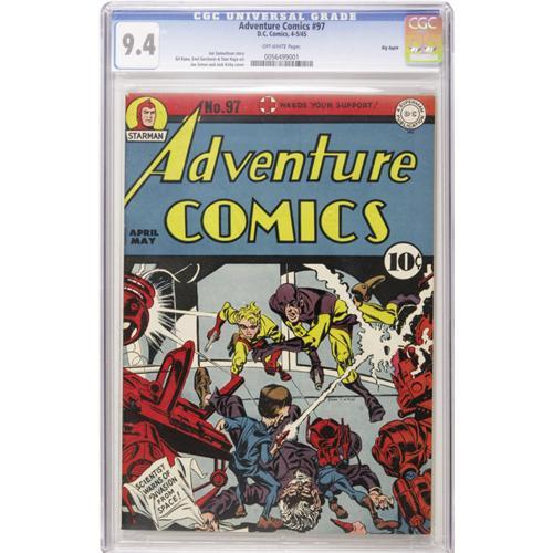 <B>Adventure Comics #97 Big Apple pedigree (DC, 1945) CGC NM 9.4 Off-white pages.</B></I> One of the most prized pedigrees offers the second highest-graded copy of this issue that CGC has seen to date. The Simon and Kirby cover absolutely rocks! A young Gil Kane contributes story art in this issue. Overstreet 2006 NM- 9.2 value = $1,300. CGC census 10/06: 1 in 9.4, 1 higher.<BR><BR><b>Shipping:</b> Slabbed Comic (<a target="_blank" href="http://www.heritageauctions.com/common/shipping.php">view shipping information</a>)