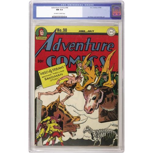<B>Adventure Comics #98 (DC, 1945) CGC NM 9.4 Off-white to white pages.</B></I> Jack Kirby demonstrated his penchant for the bizarre on this cover, with help from longtime partner Joe Simon. This is a brilliant copy that easily outgrades the VF/NM 9.0s that come next in CGC's current census. Overstreet 2006 NM- 9.2 value = $1,300. CGC census 10/06: 1 in 9.4, none higher.<BR><BR><b>Shipping:</b> Slabbed Comic (<a target="_blank" href="http://www.heritageauctions.com/common/shipping.php">view shipping information</a>)