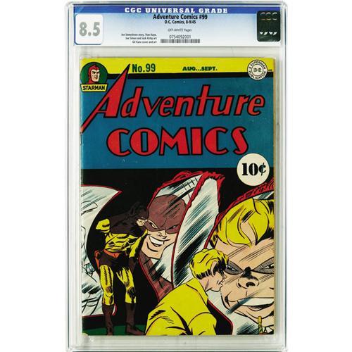 <B>Adventure Comics #99 (DC, 1945) CGC VF+ 8.5 Off-white pages.</B></I> Here's one of the finest copies yet certified of this issue starring the Sandman and Sandy (drawn on the cover by Gil Kane). Starman and the Shining Knight also appear. Overstreet 2006 VF 8.0 value = $600; VF/NM 9.0 value = $950. CGC census 3/06: 1 in 8.5, 2 higher.