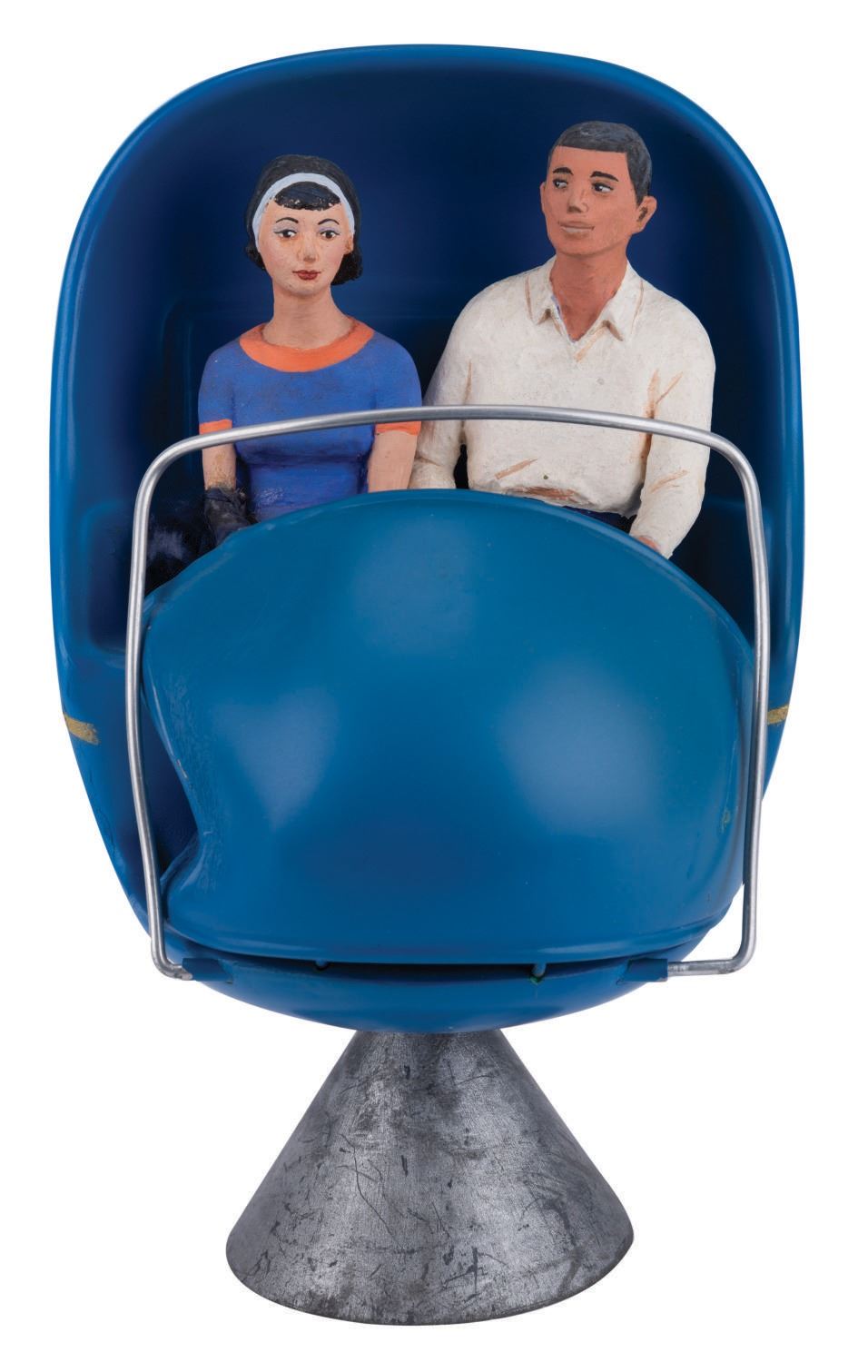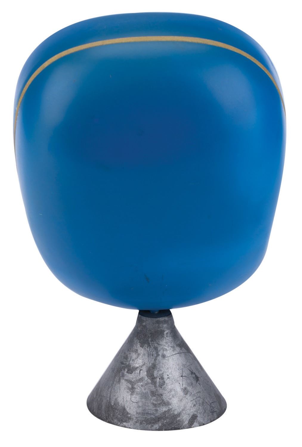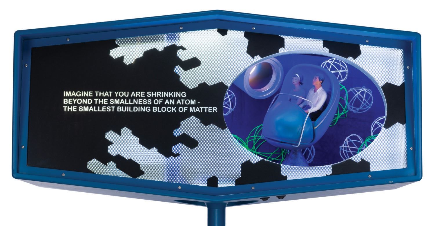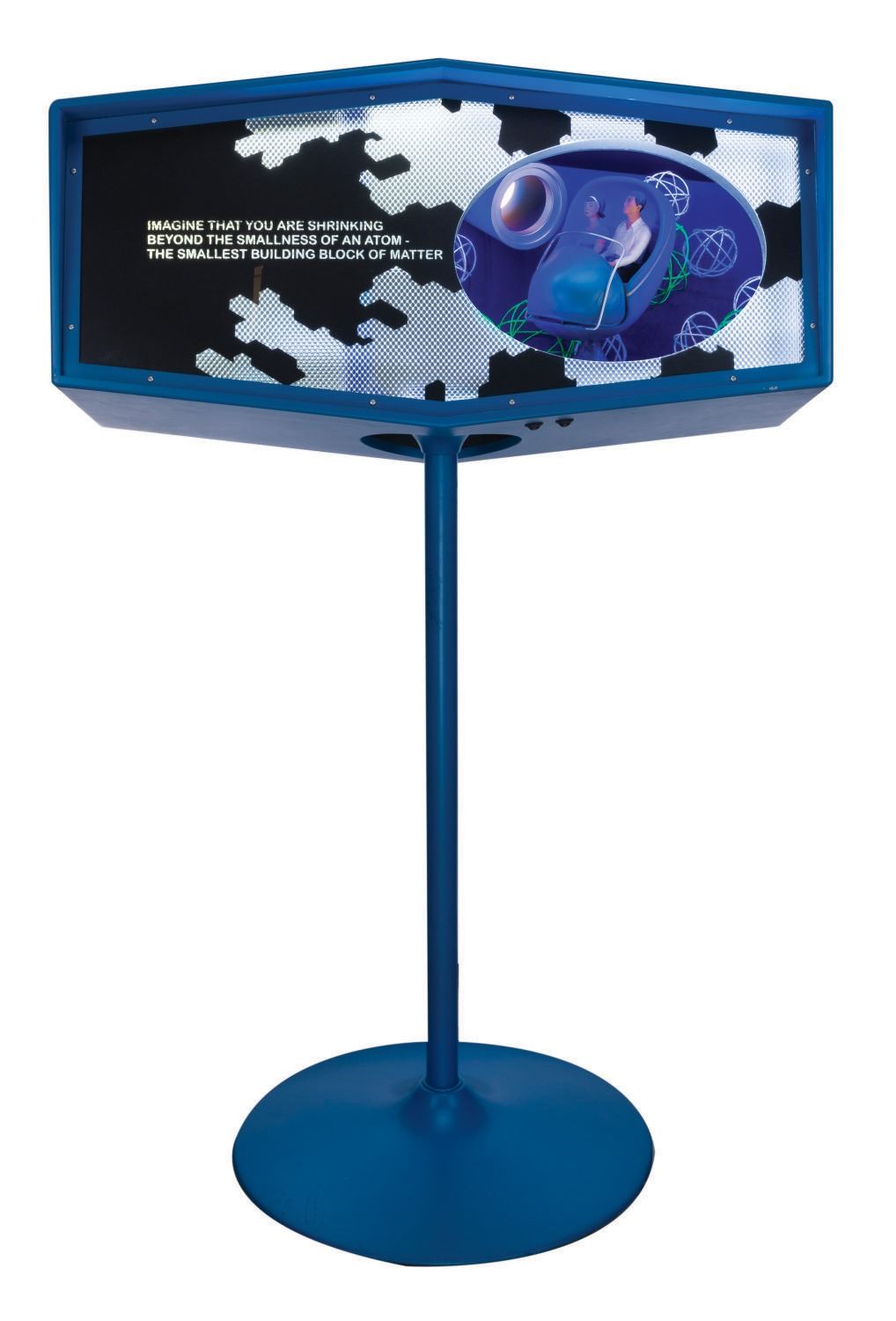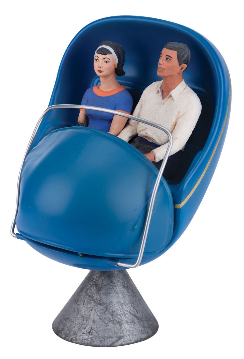 (Disneyland, 1967) An extremely rare "Atomobile" prop from Disneyland's "Adventure Thru Inner Space". While waiting in the attraction's queue, guests were entertained and informed of the adventure to come by a series of displays, each with their own Atomobile prop inside. This atomobile is from one of those displays (as opposed to one seen in the "Mighty Microscope"). To display the piece, super collector Joel Magee built a replica of the queue displays, complete with lights and sound from the attraction. The Atomobile measures 6.5" in diameter and 10" high, and is in very good condition showing light wear from Park use, and a small piece of black cloth adhered to the woman figure's right forearm, likely from original installation. The fine condition display measures 37"x16" and stands 59" tall on a 24" diameter base.