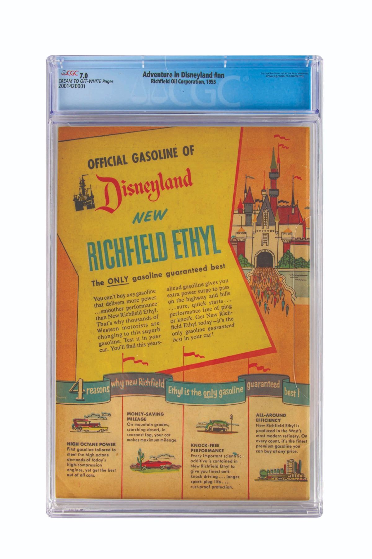 (Disneyland, 1955) A very rare early comic book by Richfield Oil that was created to promote the attractions they sponsored at Disneyland. This 14-page comic measures 10.5"x7.25" and has been given a CGC Universal Grade of 7.0, which is considered to be fine to very fine. The comic comes in a hard protective case with its CGC Universal Grade verification.