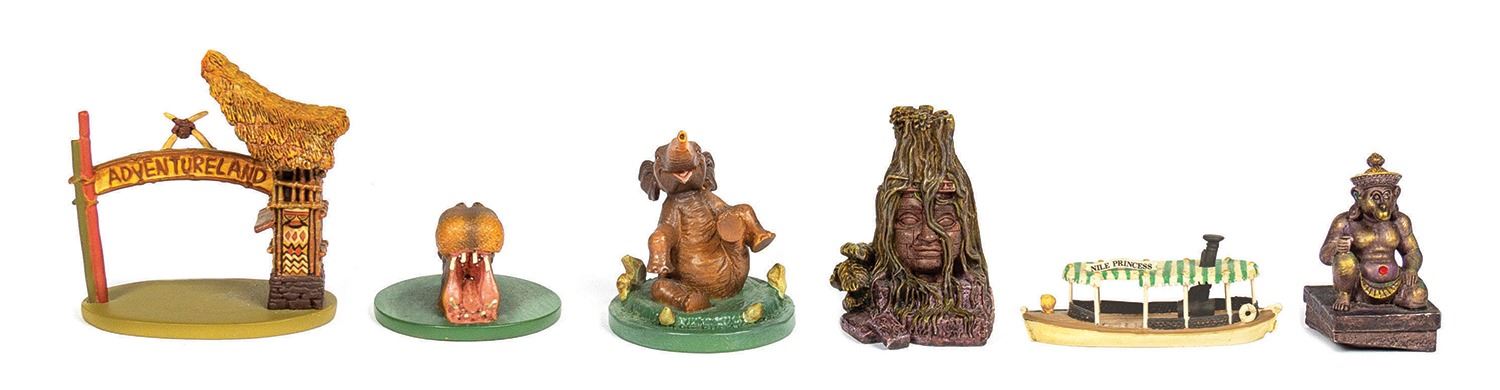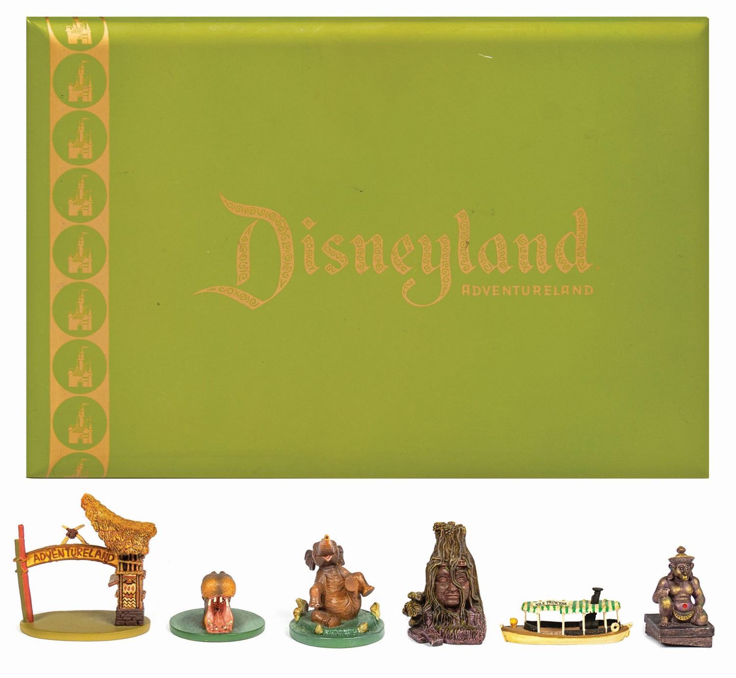 (Disneyland, 2005) A limited edition boxed set of Adventureland themed pewter miniatures created by Kevin Kidney and Jody Daily for Disneyland's 50th anniversary. The set was limited to 1500 pieces and includes miniatures of: the Nile Princess boat, a Jungle Cruise tree deity, the entrance to Adventureland, a Monkey Shrine, an Elephant, and a Hippo. The boxed set measures 7"x10" and 3.5" tall and is in very good condition with some scuffing to the box, there is also some minor scratching to pewter figures.