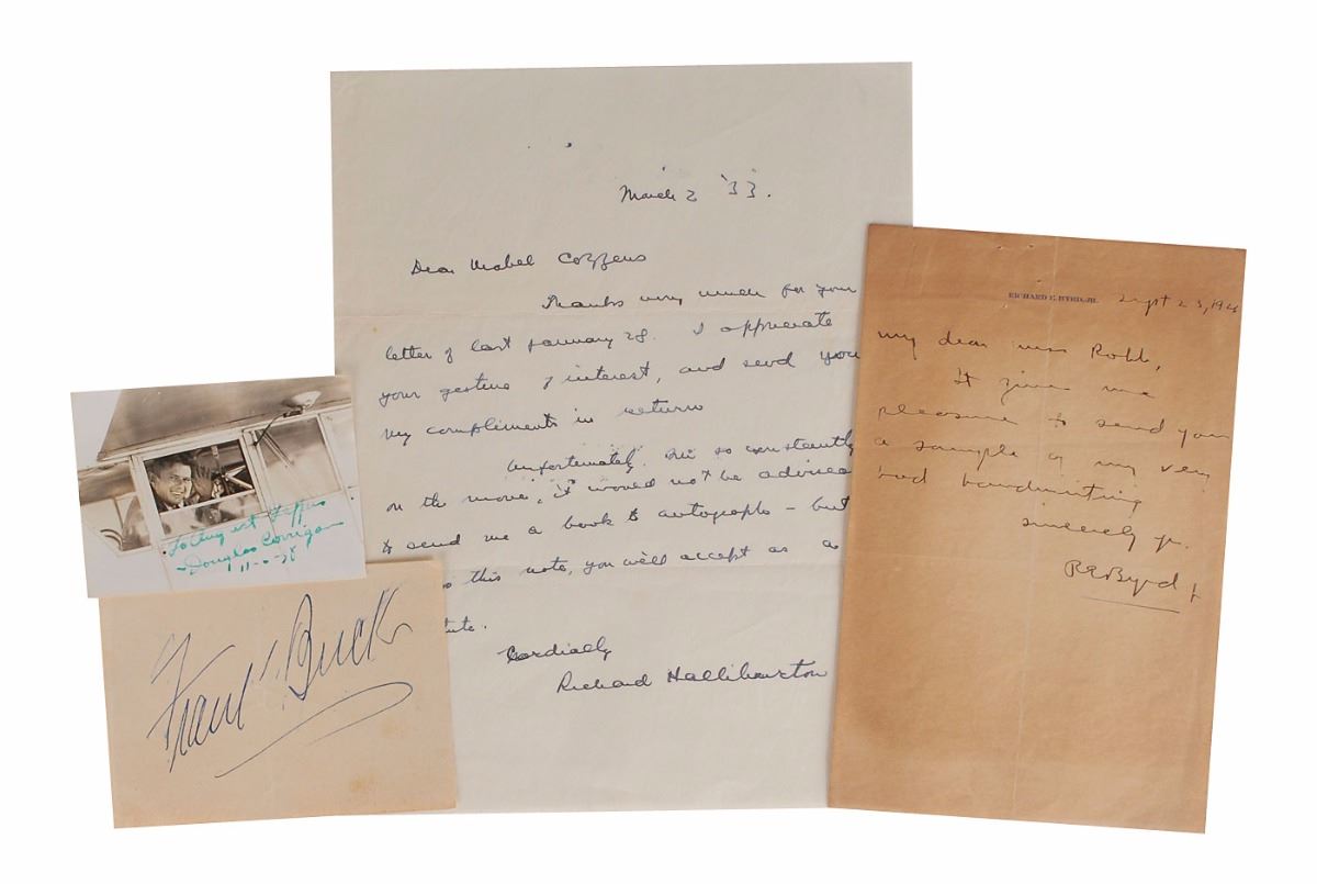 Four items signed by notable adventurers, including: Richard E. Byrd (ALS); Richard Halliburton (ALS); Frank Buck (signature); and Douglas ‘Wrong Way’ Corrigan (SP). In overall very good to fine condition, with heavy toning to the Byrd letter and some soiling to the Buck.