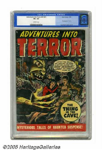<B>Adventures Into Terror #43 (#1) (Atlas, 1950) CGC VF+ 8.5 Off-white pages.</B></I> This is the first issue of the title, carrying over the numbering from <B>Joker Comics</B></I>. One of Atlas' early horror titles, this issue featured the cover and interior art of Russ Heath. Currently this ranks as the nicest copy CGC has certified of the premiere issue. Overstreet 2005 VF 8.0 value = $419; VF/NM 9.0 value = $647. CGC census 7/05: 1 in 8.5, none higher.