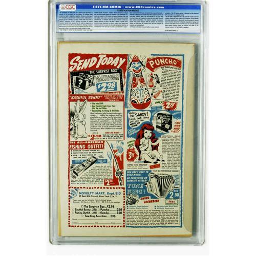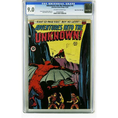 <B>Adventures Into the Unknown #10 Mile High pedigree (ACG, 1950) CGC VF/NM 9.0 Off-white to white pages.</B></I> Here's another early issue of the title considered to be the first continuous supernatural comic series... another scintillating Mile High copy... another highest-graded copy to date from CGC...ho-hum. Just kidding, this copy is anything but ho-hum -- just look at these colors! Edvard Moritz did the cover, and Moritz, Charles Sultan, and Bob Lubbers contributed interior art. Overstreet 2005 VF/NM 9.0 value = $290; NM- 9.2 value = $380. CGC census 12/05: 2 in 9.0, none higher.