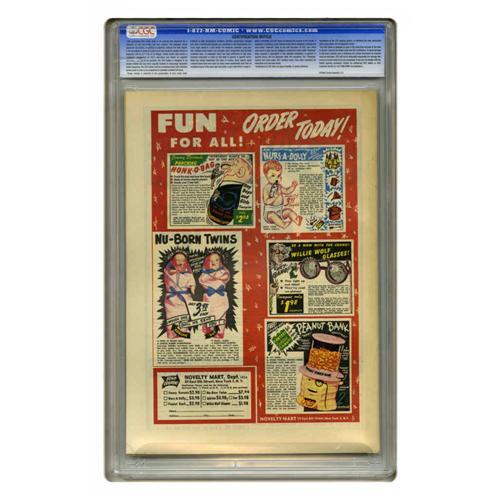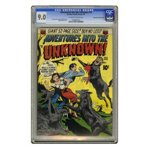 <B>Adventures Into the Unknown #18 Mile High pedigree (ACG, 1951) CGC VF/NM 9.0 Off-white to white pages.</B></I> Being attacked by hungry wolves while out walking with your girl is bad enough -- it's even worse when one of said wolves actually has a "human" face! It's another great Ogden Whitney cover illustration; interior artists include Edward Moritz. Overstreet 2005 VF/NM 9.0 value = $237; NM- 9.2 value = $310. CGC census 12/05: 3 in 9.0, 1 higher.