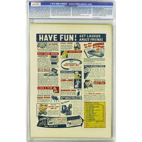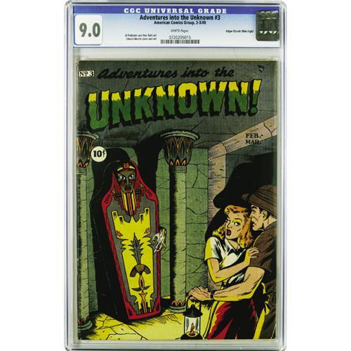 <B>Adventures Into The Unknown #3 Mile High pedigree (ACG, 1949) CGC VF/NM 9.0 White pages.</B></I> Pre-Code ACGs in this nice of a grade are rare indeed. Gerber's assessment of this issue as "uncommon" may be understated as well - just two copies have been certified to date by CGC in <I>any</B></I> grade! Edvard Moritz cover and art, with additional interior art from Al Feldstein and Ken Bald. Overstreet 2006 VF/NM 9.0 value = $761; NM- 9.2 value = $1,040. CGC census 5/06: 1 in 9.0, 1 higher. <BR><BR><B>Important notice:</B> Heritage usually auctions material at the rate of 200-250 lots per hour. On some occasions eBay Live bid software or the Internet may not be able to keep up with the pace of the auction. We recommend placing a realistic absentee bid now as insurance to avoid disappointment. Occasionally the auctioneer may eliminate or reject an eBay Live bid, and the auctioneer may also reopen a lot after the close of the eBay live bidding (usually because we missed an audience bid), and may reject your bid even if it shows you as the winning bidder. By bidding via eBay Live, you agree that Heritage may award the lot to another bidder at its sole discretion under the circumstances described above or any other reasonable circumstances. Since eBay bids are not shown to us until we open the lot on the floor, we treat those bids just like floor bids. In most cases the floor responds before the eBay bid is presented to us, due to Internet lag time, so for consistency we have made it a policy that floor bids are always considered first over tie eBay live bids. Also please note that all Heritage lots purchased through eBay Live carry a 22.5% Buyer's Premium. Please make sure you read the Terms and Conditions before you bid. This lot is being auctioned in conjunction with a live floor auction by Heritage Auction Galleries. All final auction and invoice information will be supplied by Heritage Auction Galleries, and all other information should be considered preliminary. Lot:41001 <BR><BR><B>Winning Notification and Billing:</B> After the FINAL session in this auction is complete, Heritage will send e-mail and snail mail invoices. This process normally takes several days. All final auction and invoice information will be supplied by Heritage Auction Galleries, and all other information should be considered preliminary. <BR><BR>This auction will be conducted on a live auction floor and over the Internet through eBay Live. If you choose to place an absentee bid, please take a moment to <font color='#0000ff'><u><a href='http://pages.ebay.com/liveauctions/help/before/laabsentee.html'>learn how eBay Live absentee bidding works</a></u></font><font color='#000000'>