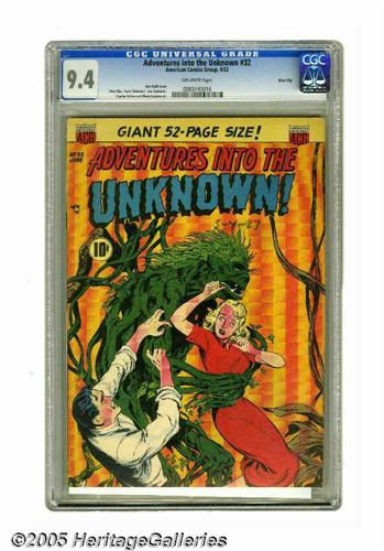 <B>Adventures Into the Unknown #32 River City pedigree (ACG, 1952) CGC NM 9.4 Off-white pages.</B></I> Finally, a pre-Code cover guy takes his girl someplace besides a cemetery... the bad news is, their date's at a haunted swamp. Ken Bald drew the cover scene, which is preserved in its original glory on this pedigree copy. This is the only copy that CGC has certified to date. Overstreet 2005 NM- 9.2 value = $210.