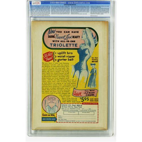 <B>Adventures Into the Unknown #4 Mile High pedigree (ACG, 1949) CGC NM- 9.2 Off-white to white pages.</B></I> The dominant black of this cover makes it especially difficult to find in even mid-grade. This beautiful copy is the highest-graded copy from CGC at this writing, and likely the finest copy in existence. Edvard Moritz cover and art, with additional interior art from Leonard Starr and Jon Blummer. Overstreet 2005 NM- 9.2 value = $500. CGC census 12/05: 1 in 9.2, none higher.