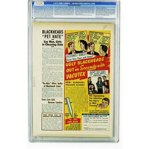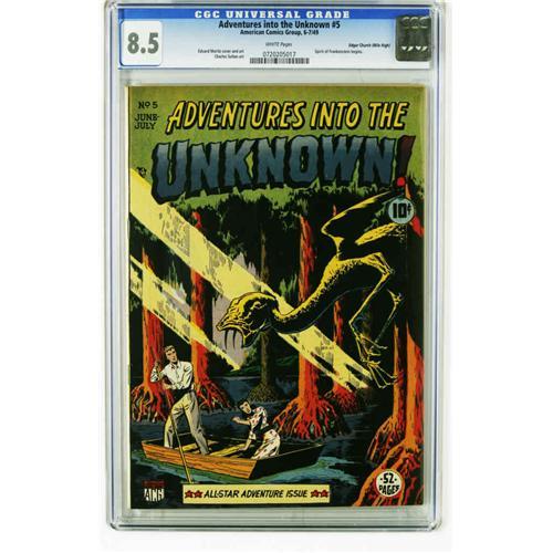 <B>Adventures Into the Unknown #5 Mile High pedigree (ACG, 1949) CGC VF+ 8.5 White pages.</B></I> The gorgeous colors on this copy are the mark of the premier pedigree in comic collecting. Our offering just misses being the highest-graded copy yet from CGC, but as the Mile High Copy, this is the most desirable. ACGs are still a relative bargain, making this beauty particularly attractive. Edvard Moritz cover and art, with Charles Sultan also providing interior art. Overstreet 2005 VF 8.0 value = $244; VF/NM 9.0 value = $372. CGC census 12/05: 1 in 8.5, 1 higher.