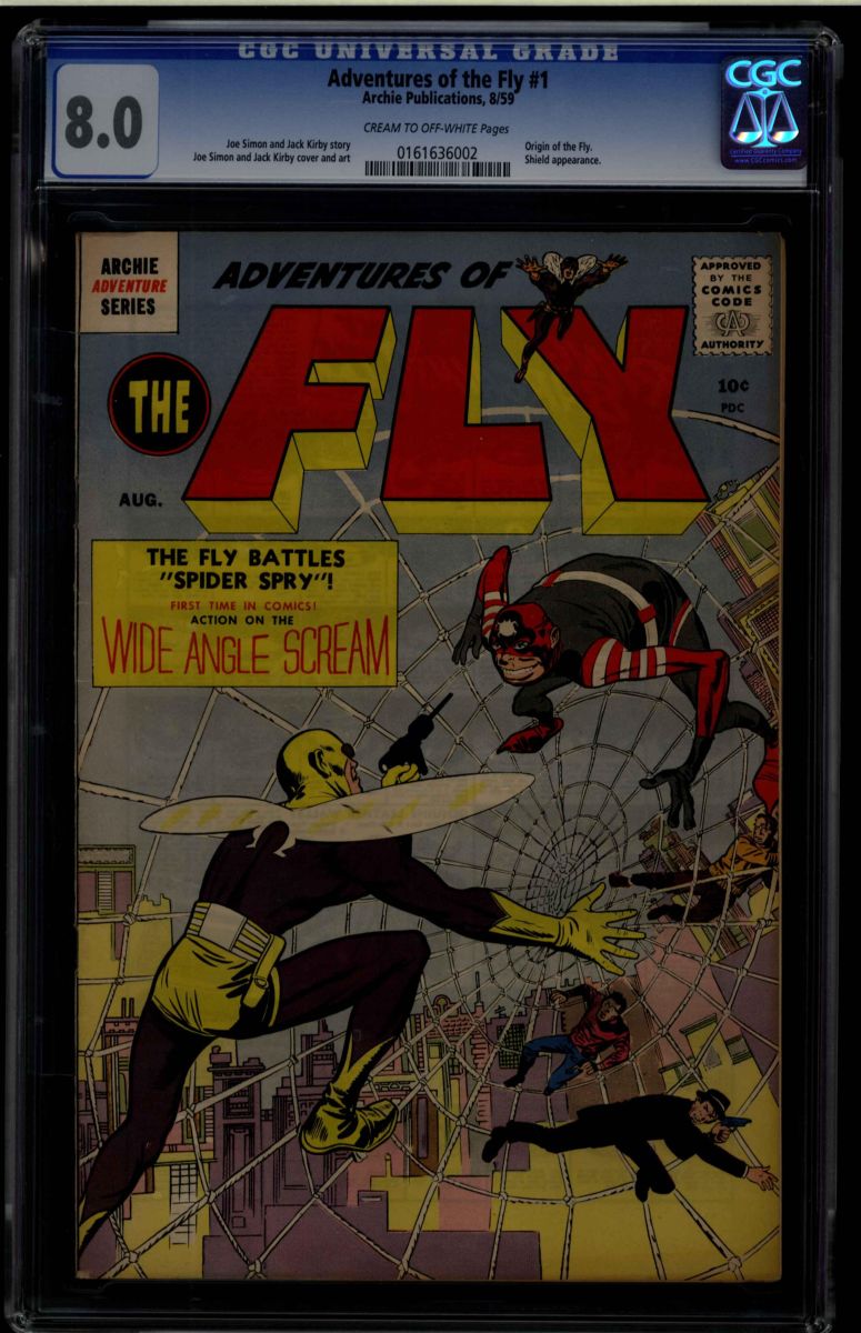 Adventures Of The Fly #1 CGC 8.0 cream to off-white pages. Joe Simon and Jack Kirby story. Jack Kirby and Joe Simon cover and art. Shield appearance. Origin of the Fly. Overstreet 2009 VF 8.0 value = $400. CGC census: 1 at 8.0, 2 higher.