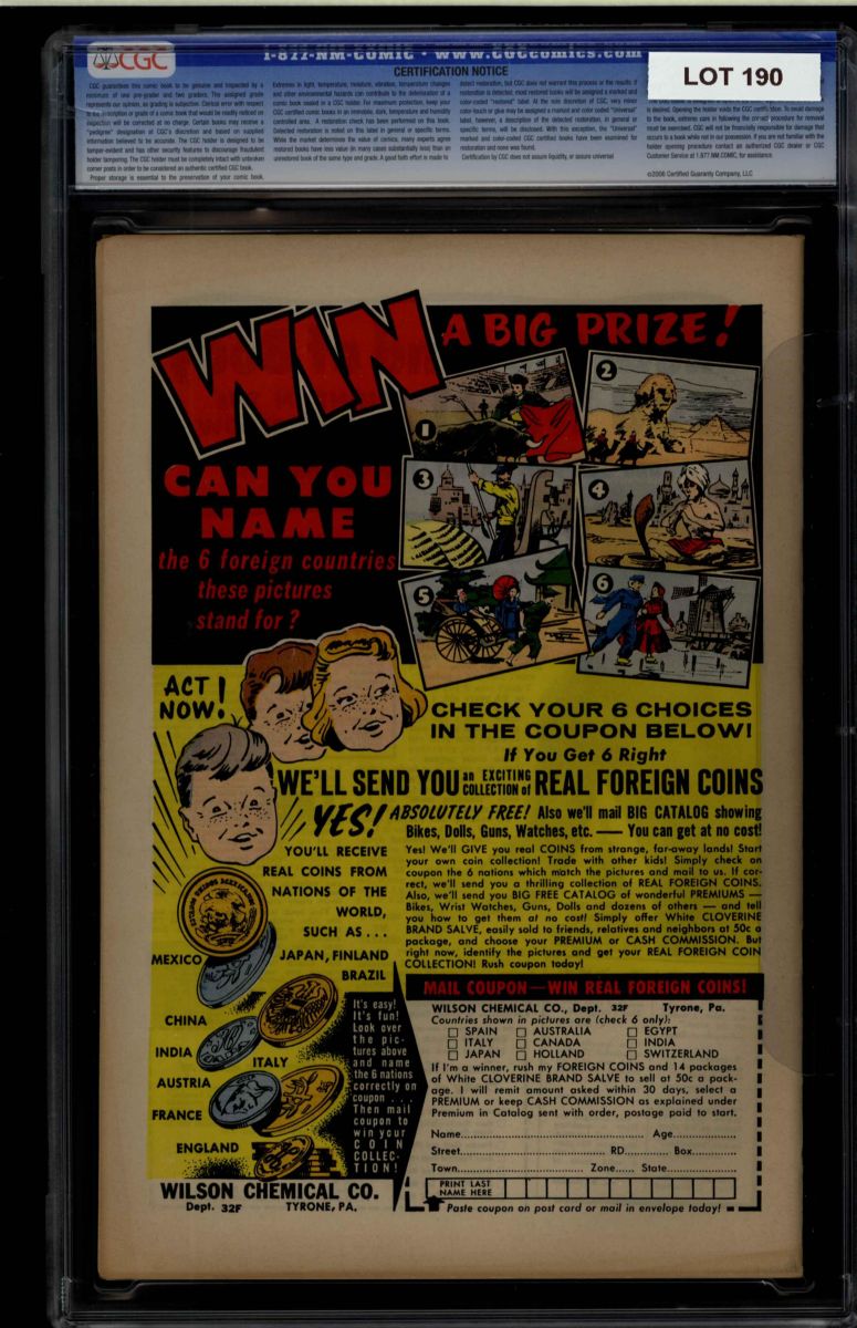 The Auctioneer has reserved the right to reject any and all bids, and to bid at the auction. Auctioneers Auctions are not on approval. Auctioneer does not allow certified material to be returned because of possible differences of opinion with respect to the grade offered by any third party organization, dealer, or service. Absolutely no guarantee of grade is offered for un-certified property sold and subsequently submitted to a third-party grading service. There will be no exceptions to this policy. Under extremely limited circumstances, (e.g. gross cataloging error) a purchaser, who did not bid from the floor, may request Auctioneer to evaluate voiding a sale; such request must be made in writing detailing the alleged gross error, and submission of the lot to the Auctioneer must be pre-approved by the Auctioneer. Bidder must notify Auctioneer in writing of such request within three (3) days of the non-floor bidder receipt of the lot. Any lot that is to be evaluated must be in our offices within 30 days after Auction. Grading does not qualify for this evaluation process nor do such complaints constitute a basis to challenge the authenticity of a lot. AFTER THAT 30-DAY PERIOD, NO LOTS MAY BE RETURNED FOR REASONS OTHER THAN AUTHENTICITY. Lots returned must be housed intact in the original holder. No lots purchased by floor Bidders may be returned (including those Bidders acting as agents for others). Late remittance for purchases may be considered just cause to revoke all return privileges. B: Auctions conducted solely on the Internet have a THREE (3) DAY RETURN POLICY: Lots paid for within seven days of the Auction closing are sold with a three (3) day return privilege. You may return lots under the following conditions: Within three days of receipt of the lot, you must first notify Auctioneer by contacting Client Service by phone (314-680-8599) or e-mail (moundcityauctions@gmail.com), and immediately mail the lot(s) fully insured to the attention of Returns, Mound City Auctions 1081 Teson Rd. Hazelwood, MO. 63042. Lots must be housed intact in their original holder and in their original condition. You are responsible for the insured, safe delivery of any lots. Auctioneer will not be responsible for lots returned in non-registered mail or lots returned without prior authorization per section B. A non-negotiable return fee of 5% of the purchase price ($10 per lot minimum) will be deducted from the refund for each returned lot or billed directly. Postage and handling fees are not refunded. After the three-day period (from receipt), no items may be returned for any reason. Late remittance for purchases revokes all Return-Restock privileges. C: Bidders who have inspected the lots prior to the auction will not be granted any return privileges. D: Comic books sold referencing a third-party grading service are sold “as is” without any express or implied warranty. Certain warranties may be available from the grading services and the Bidder is referred to them for further details: Certified Guaranty Company, LLC. (CGC), P.O. Box 4738, Sarasota, FL 34230. E: Bidders who intend to challenge authenticity or provenance of a lot must notify Auctioneer in writing within thirty (30) days of the Auctions conclusion. In the event Auctioneer cannot deliver the lot or subsequently it is established that the lot lacks title, provenance, authenticity, or other transfer or condition issue is claimed, Auctioneer's liability shall be limited to rescission of sale and refund of purchase price; in no case shall Auctioneer's maximum liability exceed the high bid on that lot, which bid shall be deemed for all purposes the value of the lot. After one year has elapsed, Auctioneer's maximum liability shall be limited to any commissions and fees Auctioneer earned on that lot. F: All comics are guaranteed genuine, but are not guaranteed as to grade, since grading is a matter of opinion, an art and not a science, and therefore the opinion rendered by the Auctioneer or any third party grading service may not agree with the opinion of others (including trained experts), and the same expert may not grade the same item with the same grade at two different times. G: Since we cannot examine encapsulated comics, they are sold “as is”without our grading opinion, and may not be returned for any reason. Auctioneer shall not be liable for any patent or latent defect or controversy pertaining to or arising from any encapsulated collectible. In any such instance, purchaser's remedy, if any, shall be solely against the service certifying the collectible. H: Due to changing grading standards over time, differing interpretations, and to possible mishandling of items by subsequent owners, Auctioneer reserves the right to grade items differently than shown on certificates from any grading service that accompany the items. Auctioneer also reserves the right to grade items differently than the grades shown in the prior catalog should such items be reconsigned to any future auction. I: Although consensus grading is employed by most grading services, it should be noted as aforesaid that grading is not an exact science. In fact, it is entirely possible that if a lot is broken out of a plastic holder and resubmitted to another grading service or even to the same service, the lot could come back with a different grade assigned. J: Certification does not guarantee protection against the normal risks associated with potentially volatile markets. The degree of liquidity for certified collectibles will vary according to general market conditions and the particular lot involved. For some lots there may be no active market at all at certain points in time."